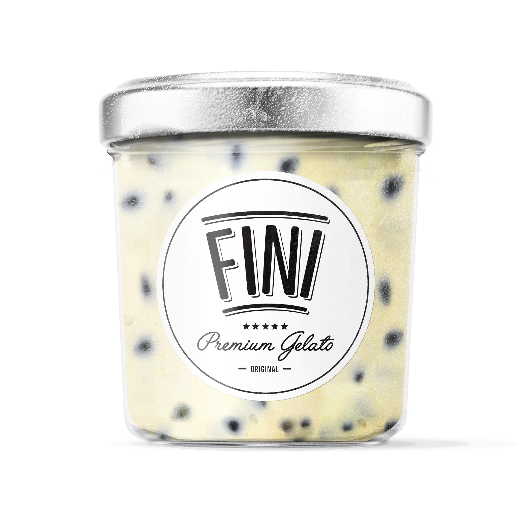 • Frasco de gelado creme com manchas escuras e rótulo com texto FINI Premium Gelato ORIGINAL